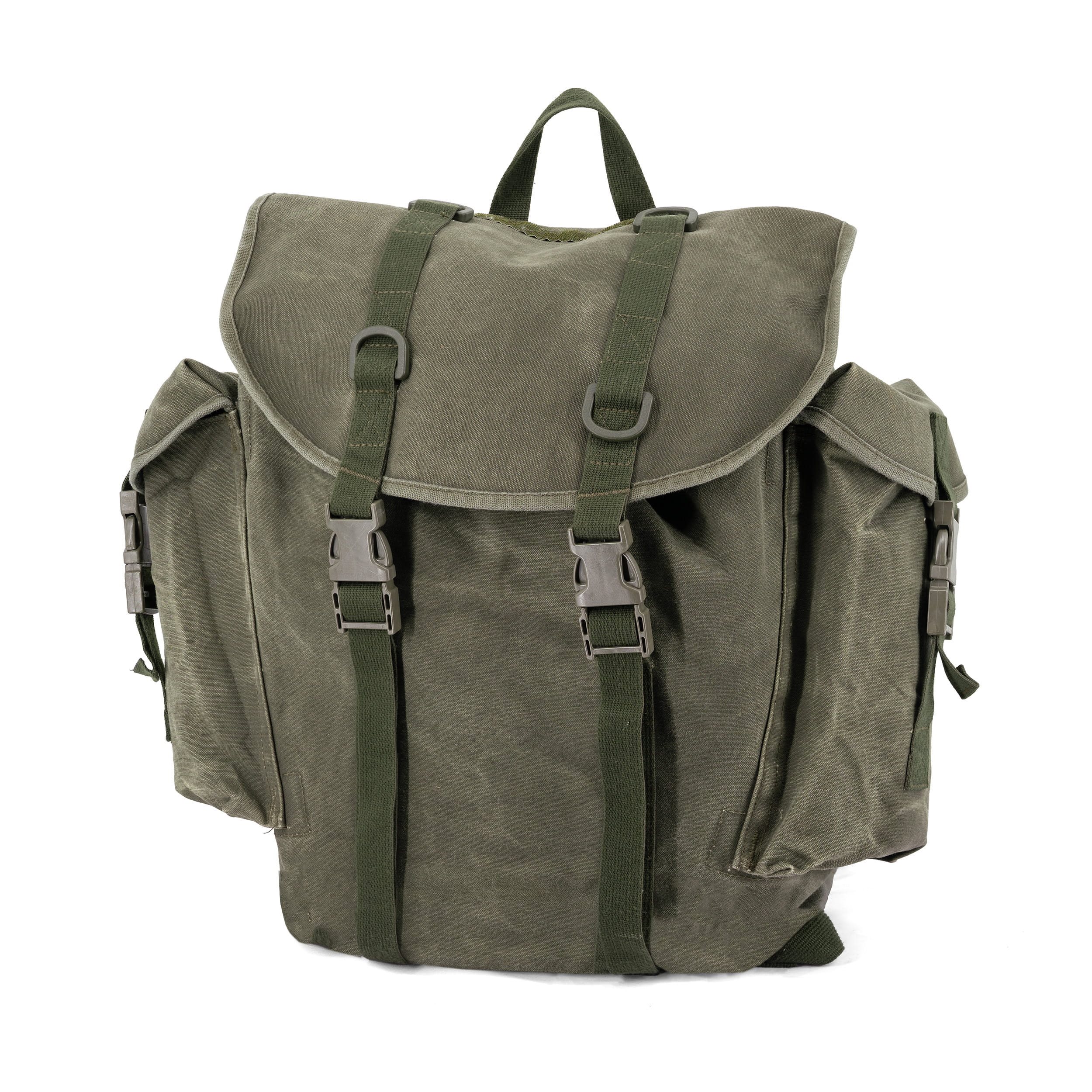 Originální lehký, plátěný horský batoh BW armády. Dvě boční kapsy kryté klopou se stahováním. Stahovací řemeny na klopě. Popruh sloužící jako bederní pás. Na vršku batohu jsou umístěny oka pro připevnění např. deky Další informace