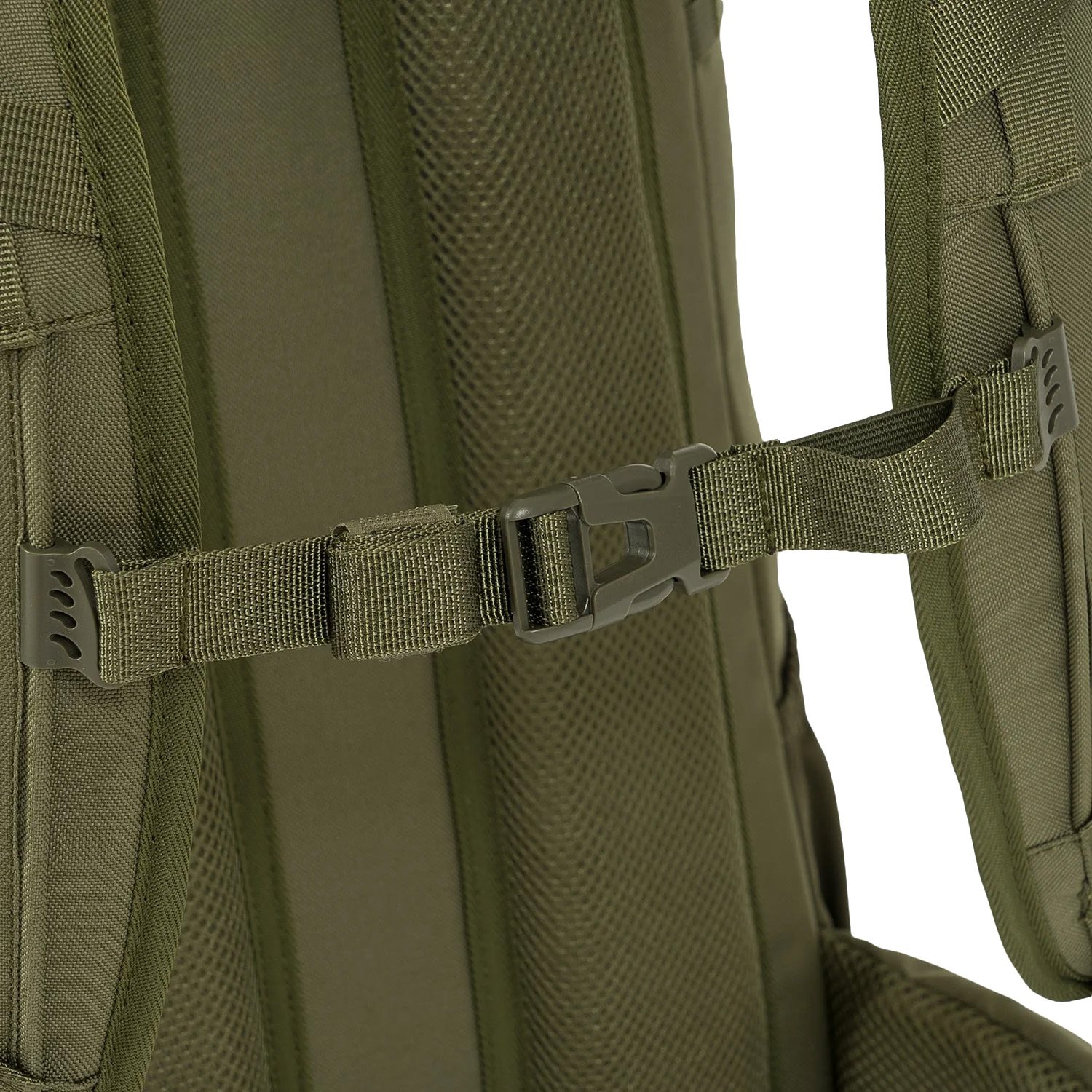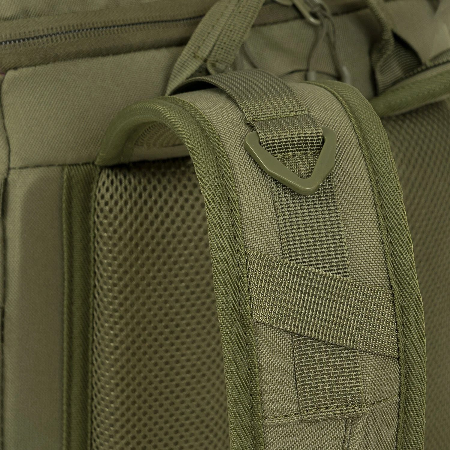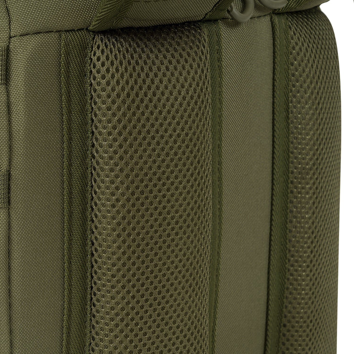 Záda batohu jsou bohatě polstrována pomocí 3D síťoviny jejíž tvar zachovává středový kanálek zlepšující odvětrávání. V horní části zad naleznete klasické látkové madlo na přenášení. Nosné popruhy jsou plně nastavitelné, polstrované, disponují stabilizačními popruhy, plastovými triangly, průvleky na protažení hadičky hydratačního vaku a výškově nastavitelným elastickým hrudním popruhem, který je spínán plastovou přezkou. Bederák batohu je částečně polstrovaný, spínaný plastovou přezkou a na obou stranách disponuje menšími kapsami uzavíranými zipem. Na bocích batohu naleznete tři řady redukované MOLLE/PALS vazby a elastické kapsy. Hlavní chlopeň batohu je opatřena pruhem MOLLE/PALS vazby, prostornou středovou přihrádkou, vrchní kapsou a malým VELCRO panelem.