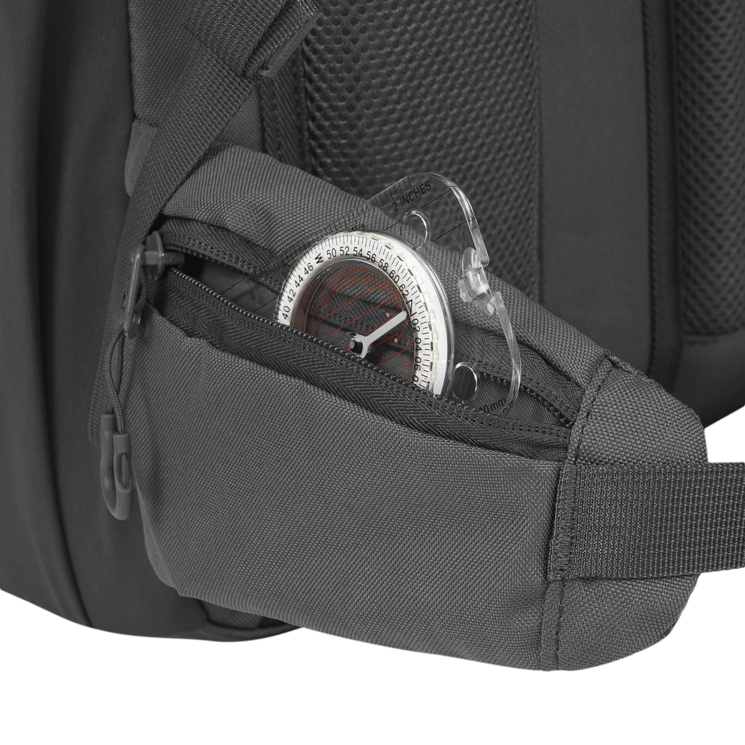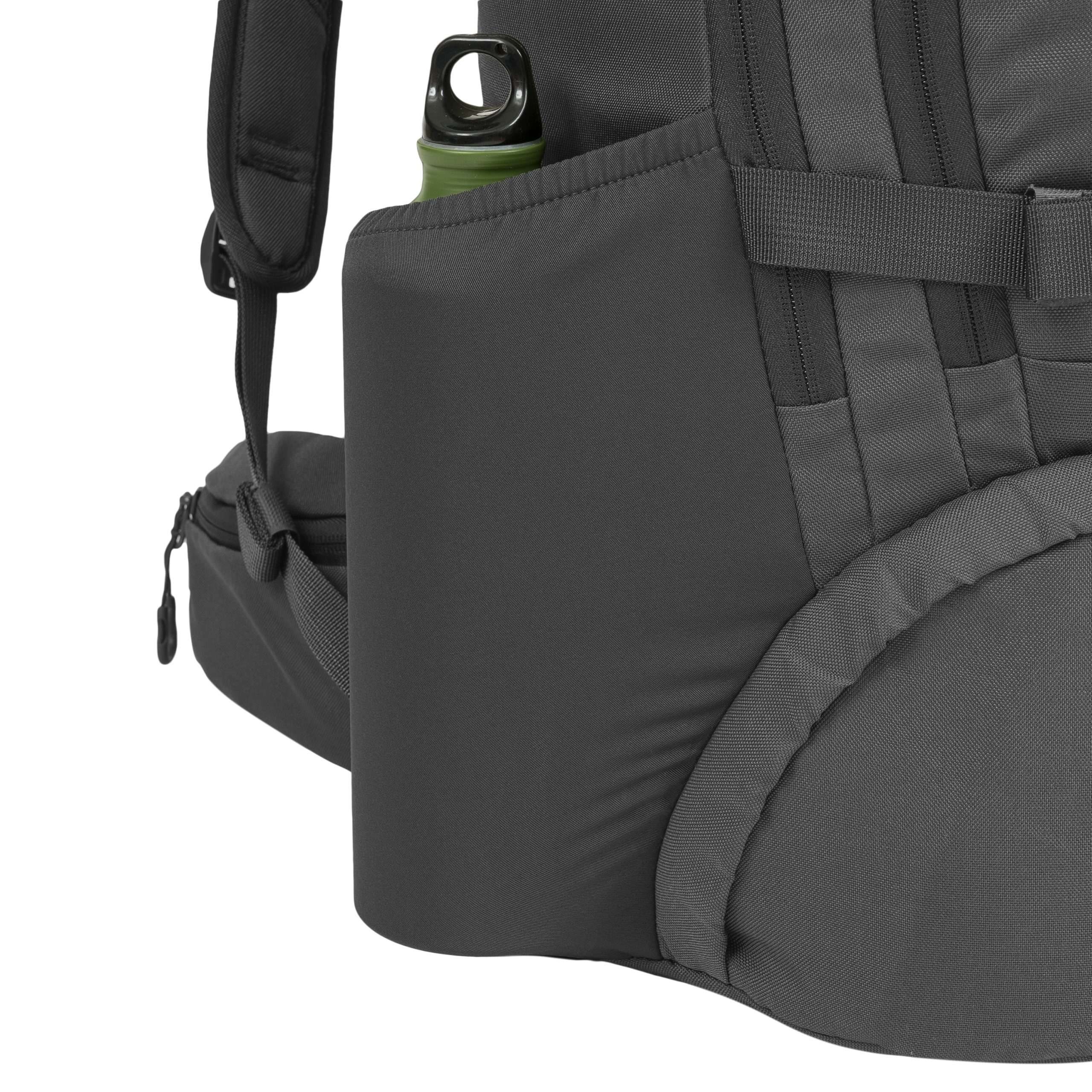 Záda batohu jsou bohatě polstrována pomocí 3D síťoviny jejíž tvar zachovává středový kanálek zlepšující odvětrávání. V horní části zad naleznete klasické látkové madlo na přenášení. Nosné popruhy jsou plně nastavitelné, polstrované, disponují stabilizačními popruhy, plastovými triangly, průvleky na protažení hadičky hydratačního vaku a výškově nastavitelným, elastickým hrudním popruhem, který je spínán plastovou přezkou. Bederák batohu je částečně polstrovaný, spínaný plastovou přezkou a na obou stranách disponuje menšími kapsami uzavíranými zipem. Na bocích batohu naleznete tři řady redukované MOLLE/PALS vazby, elastické kapsy a kompresní popruhy, které jsou spínané pomocí plastových přezek. Hlavní chlopeň batohu je opatřena pruhem MOLLE/PALS vazby, prostornou středovou přihrádkou, vrchní kapsou a malým VELCRO panelem.