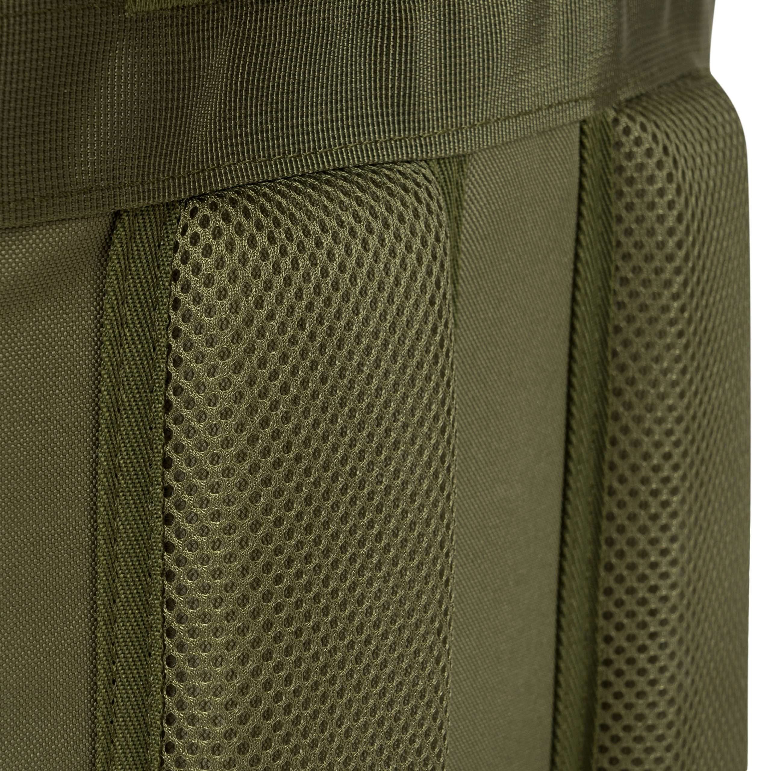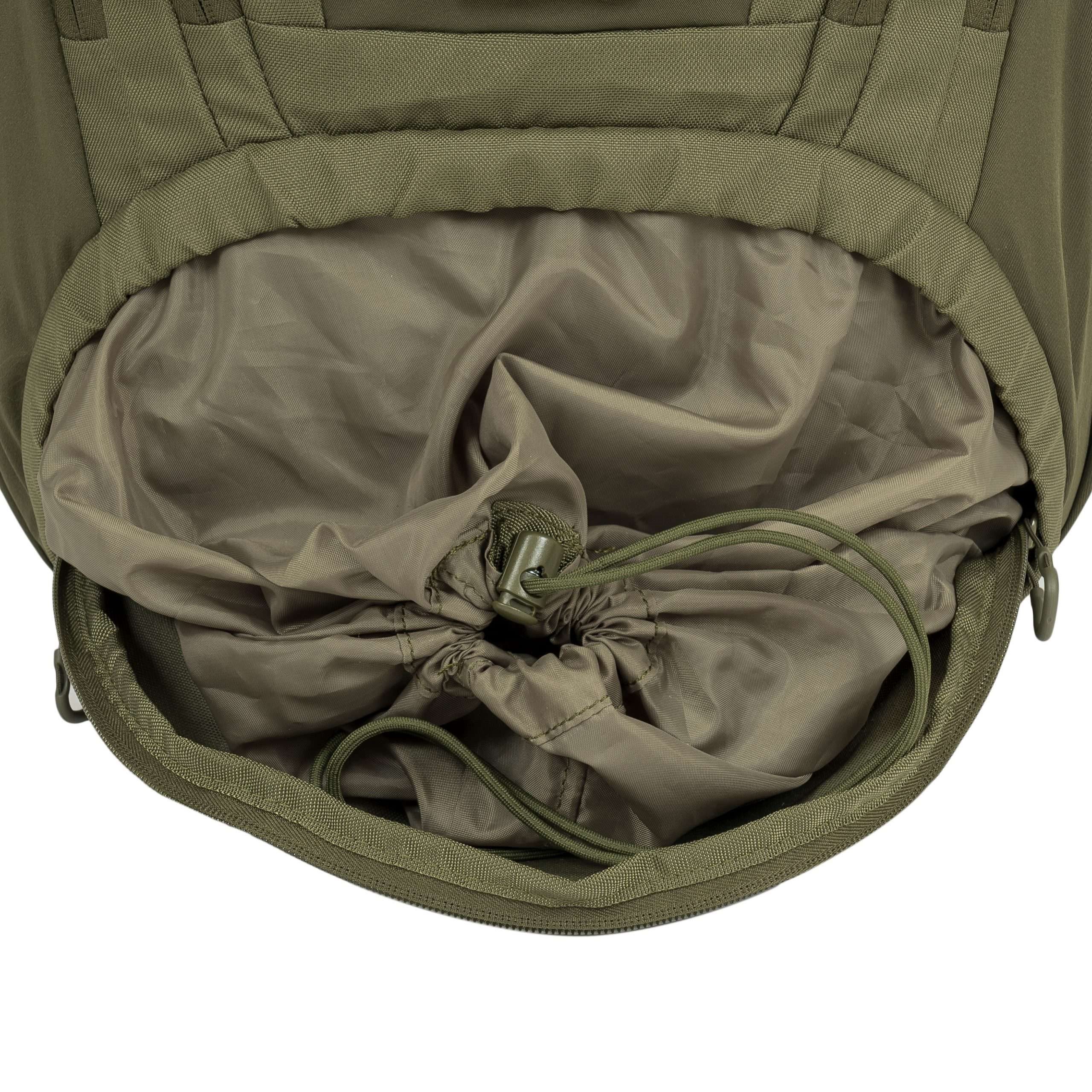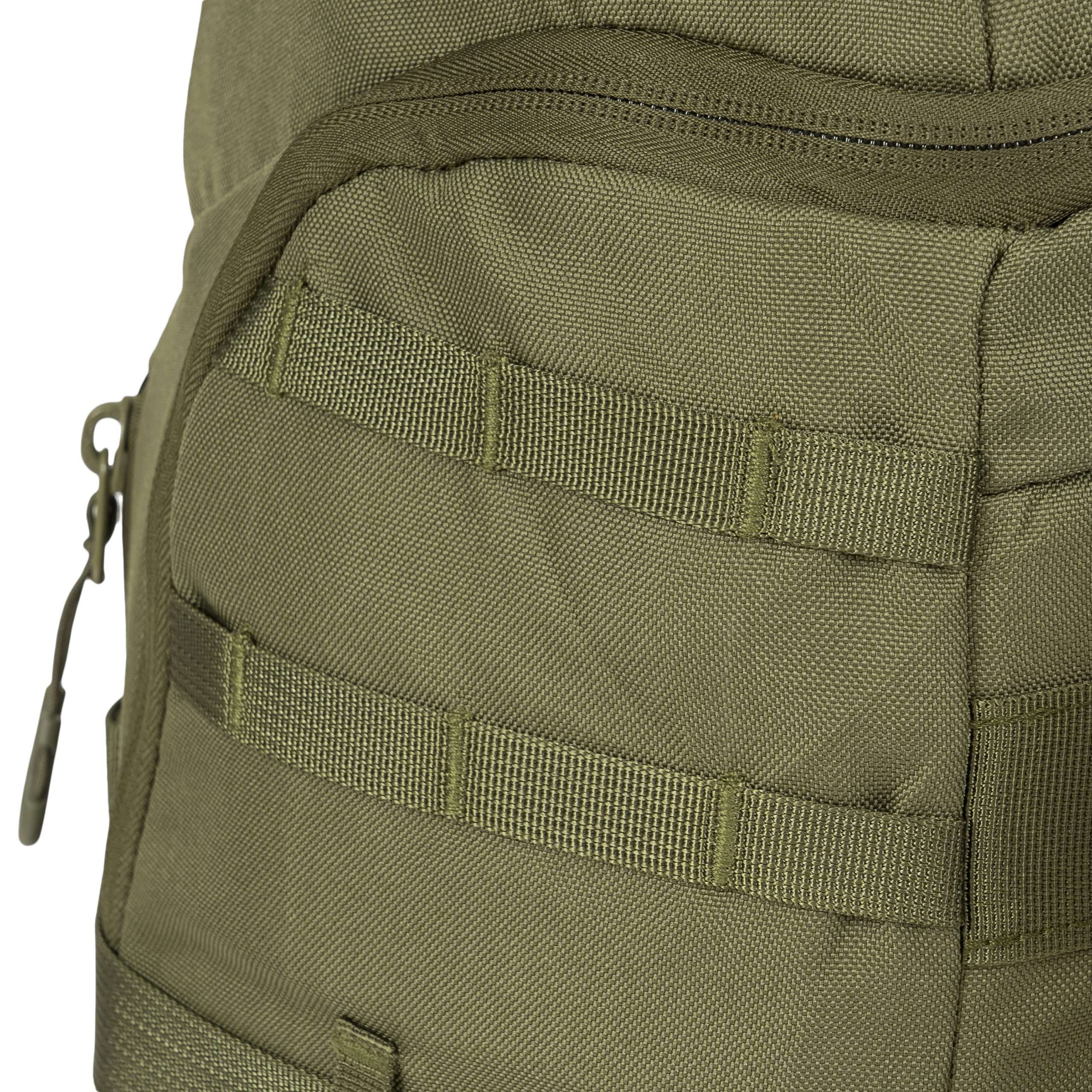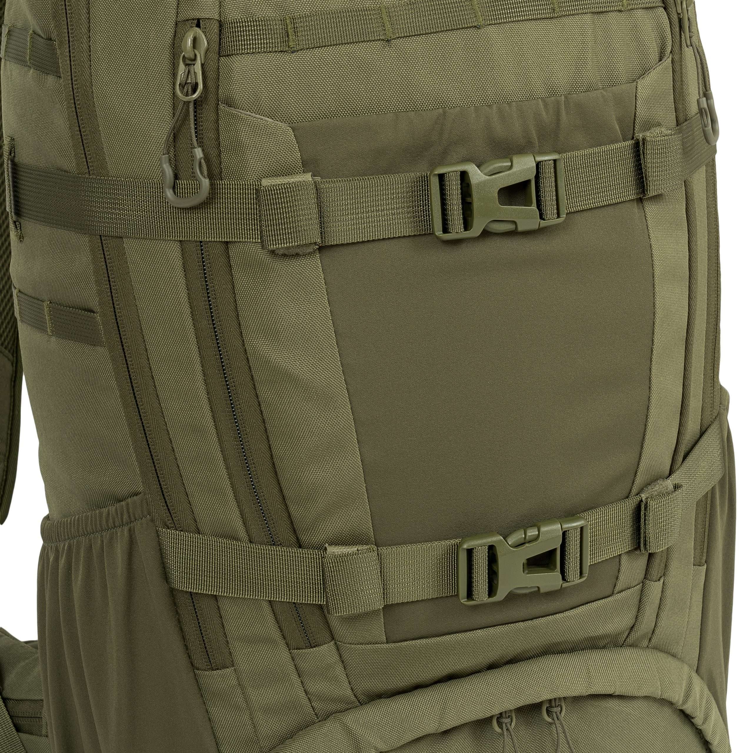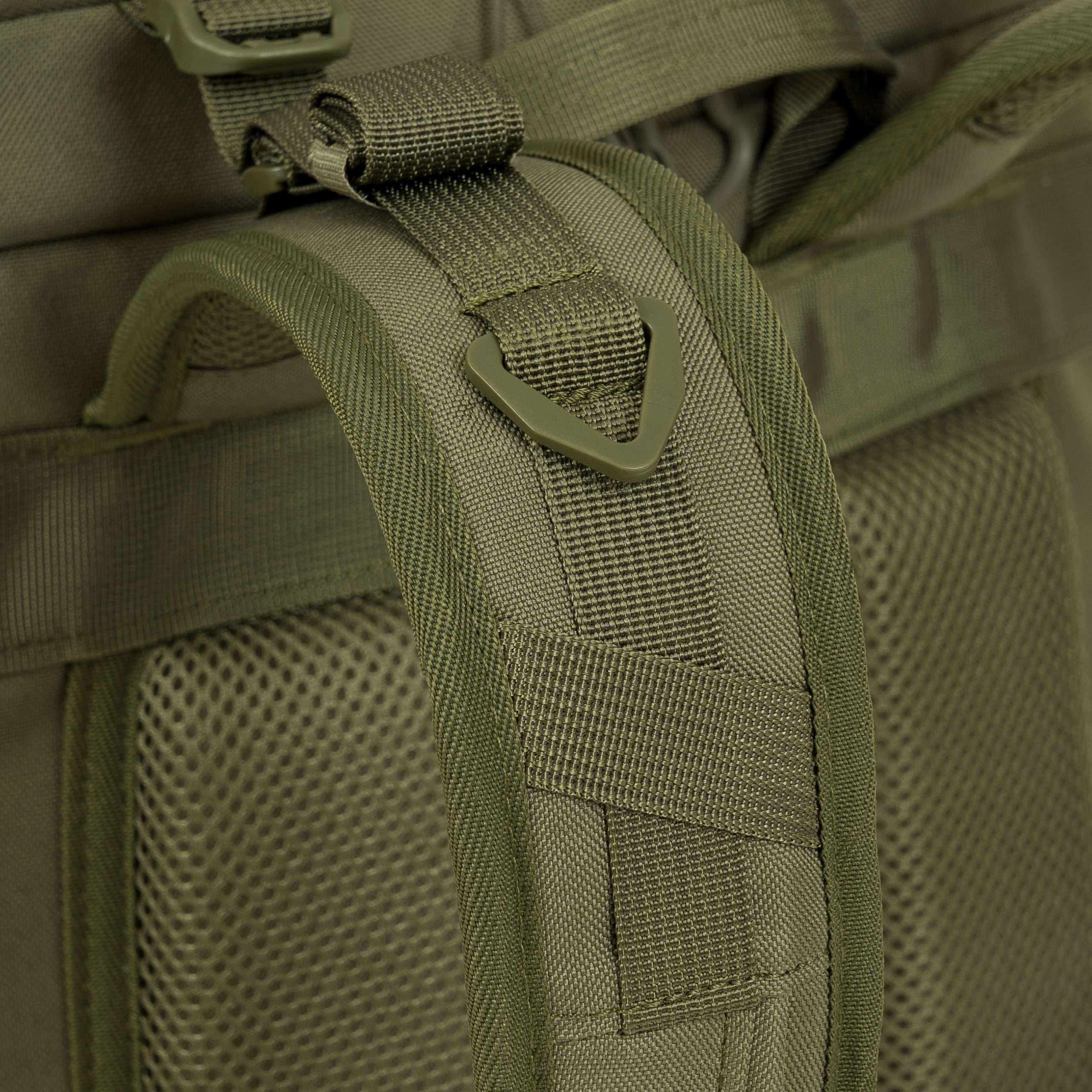 Záda batohu jsou bohatě polstrována pomocí 3D síťoviny jejíž tvar zachovává středový kanálek zlepšující odvětrávání. V horní části zad naleznete klasické látkové madlo na přenášení. Nosné popruhy jsou plně nastavitelné, polstrované, disponují stabilizačními popruhy, plastovými triangly, průvleky na protažení hadičky hydratačního vaku a výškově nastavitelným, elastickým hrudním popruhem, který je spínán plastovou přezkou. Bederák batohu je částečně polstrovaný, spínaný plastovou přezkou a na obou stranách disponuje menšími kapsami uzavíranými zipem. Na bocích batohu naleznete tři řady redukované MOLLE/PALS vazby, elastické kapsy a kompresní popruhy, které jsou spínané pomocí plastových přezek. Hlavní chlopeň batohu je opatřena pruhem MOLLE/PALS vazby, prostornou středovou přihrádkou, vrchní kapsou a malým VELCRO panelem.