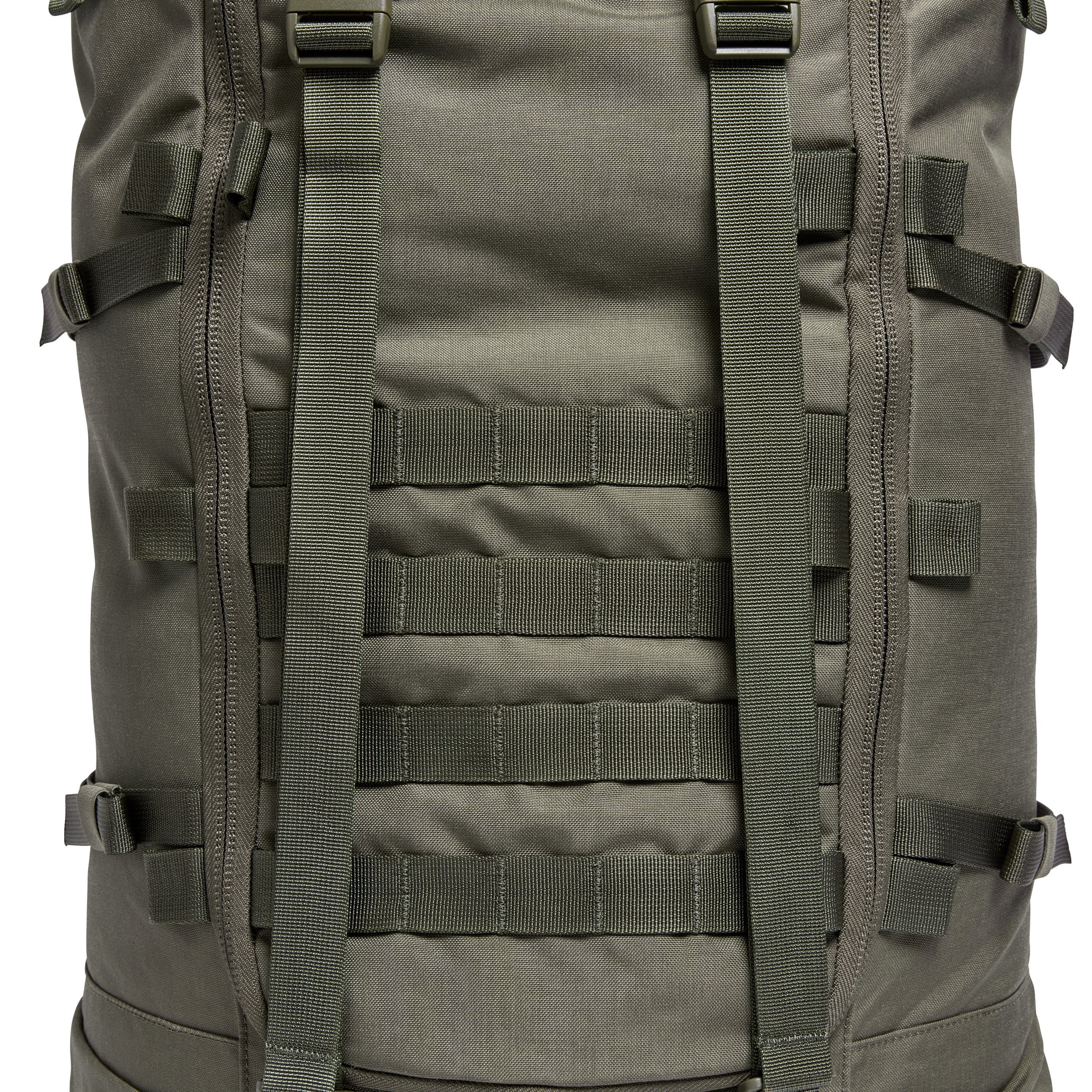 Nosné popruhy jsou délkově nastavitelné, anatomicky zakřivené, opatřené elastickými průvleky a výškově nastavitelným hrudním popruhem. Bederní pás je z části polstrovaný a z části tvořený jednoduchým popruhem spínaným přezkou bergbuckle. Záda jsou mohutně polstrovaná se zachováním středového kanálu pro zlepšení průtoku vzduchu. Boky batohu jsou opatřené kompresními popruhy a kapsami, do kterých můžete rychle uschovat bederní pás. V přední části batohu naleznete chlopeň s přístupem do batohu, čtyři rady modulární vazby standardu MOLLE/PALS a popruhy fixující chlopeň kryjící horní vstup do batohu. Horní chlopeň disponuje suchým zipem pro vaše VELCRO nášivky a menší plochou kapsou uzavíranou zipem. Uvnitř hlavního úložného prostoru naleznete vnitřní pojistné kompresní popruhy, kapsu ze síťoviny a přihrádku na uložení hydratačního vaku.