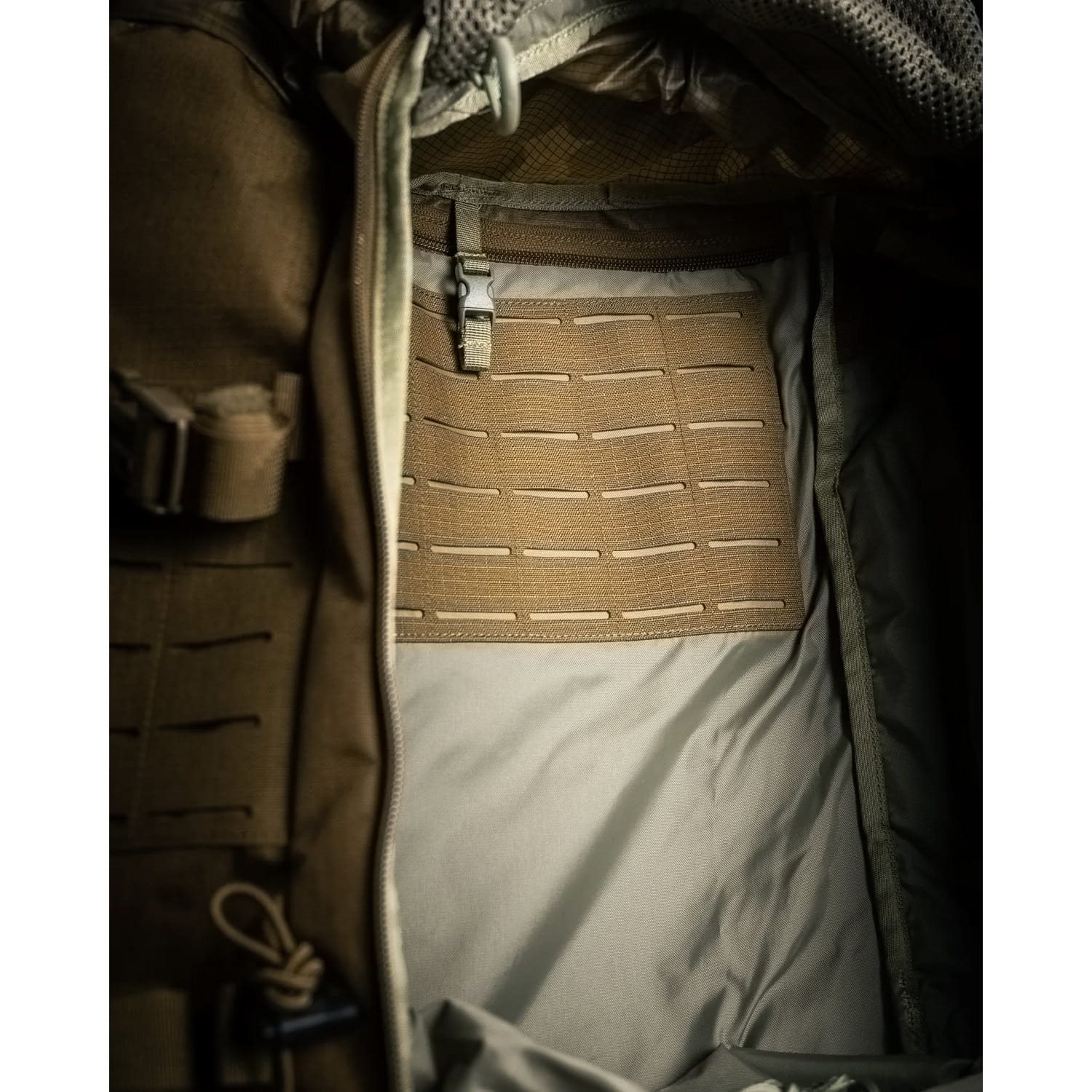 Pro snadnou organizaci je batoh z vnější strany opatřený dvojicí čelních kapes přístupných skrze dvoucestné zipy a dvojicí bočních kapes z částečně elastického materiálu. Celkem čtyři boční nastavitelné popruhy je možné využít k rychlé a snadné kompresi batohu. Interiér hlavní komory je přístupný skrze přední vstup, popřípadě skrze horní rolovací rukáv spínaný fastex přezkou. Hlavní komora je pomocí interního límce rozdělená na dvě části, uvnitř naleznete poutko pro umístění hydratačního vaku a panel laserem vyřezávané modulární vazby pro fixaci například radiostanice.