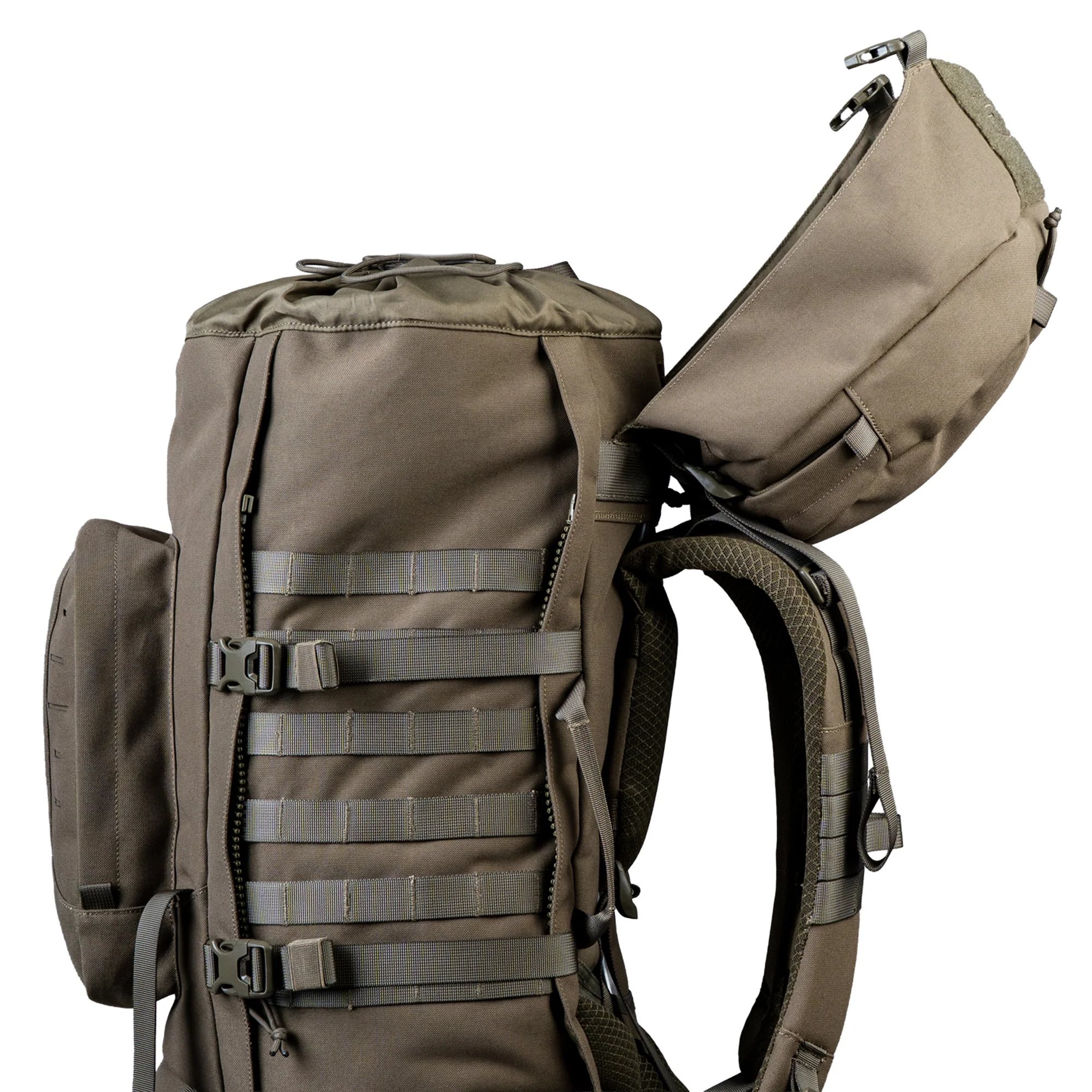 Laserem řezaná MOLLE vazba a odnímatelné boční kapsy umožňují přizpůsobení batohu přesně podle typu mise.