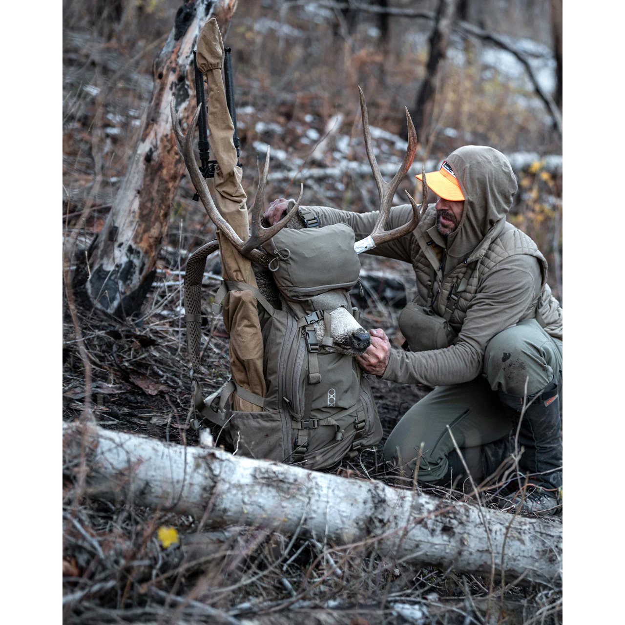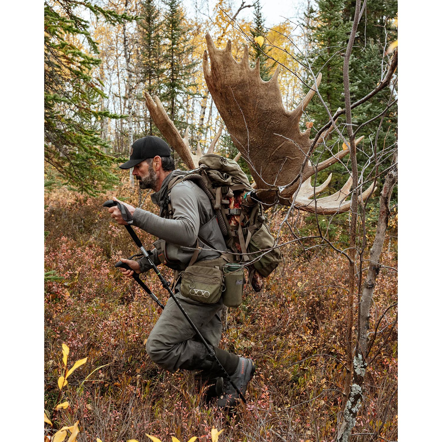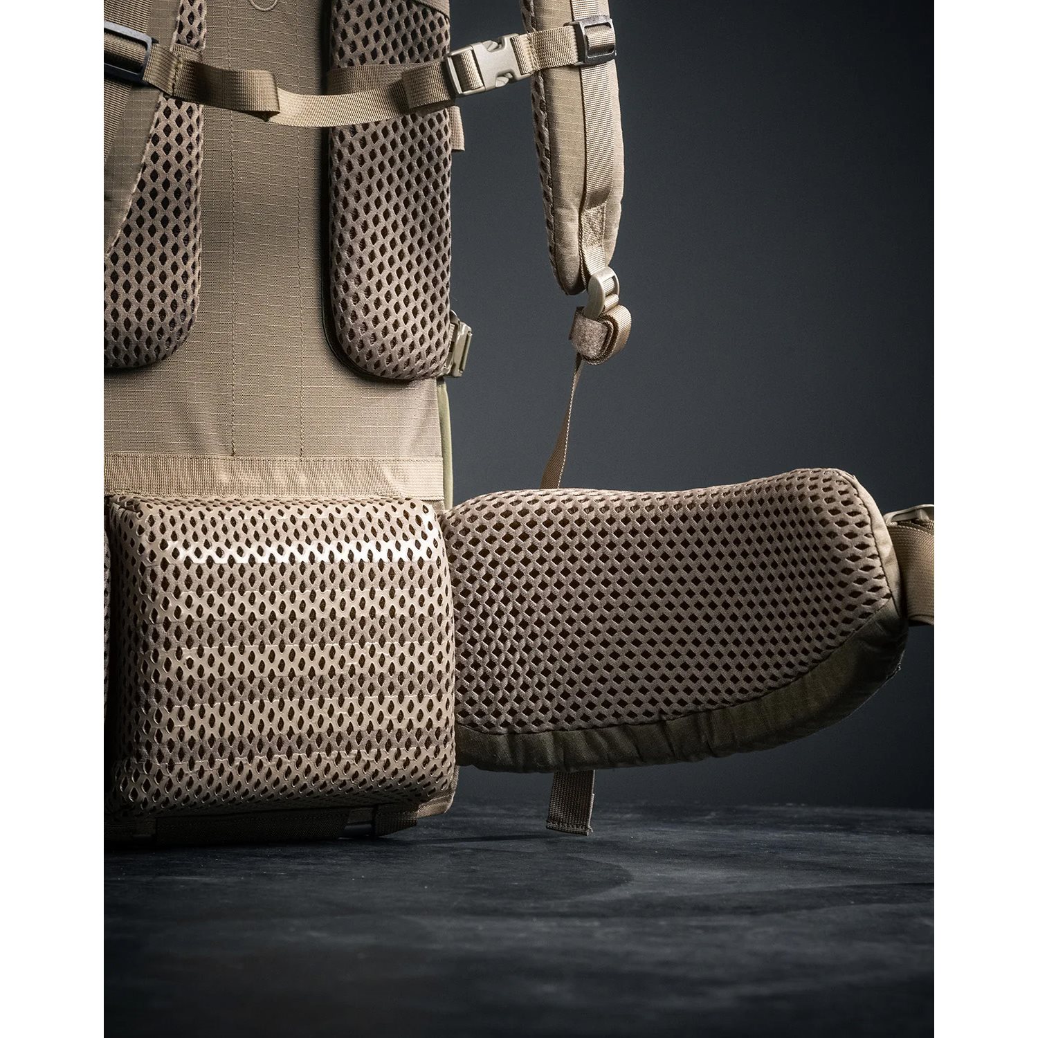 Hliníkový nosný systém je tvarovaný pro maximální oporu zad. V případě potřeby je možné batoh celý odejmout a zádový systém používat samostatně, či v kombinaci s dalším kompatibilním příslušenstvím z produktové řady EMOD HUNT od značky EBERLESTOCK. Ramenní popruhy jsou opatřené stabilizačními dorazy, elastickým hrudním popruhem a je možné je výškově nastavit dle potřeb uživatele. Bederák disponuje opravdu masivním polštářkem pokrytým silikonem, který zabraňuje nechtěnému klouzání batohu při dynamickém pohybu. Boky bederáku jsou také silně polstrované a spínají se pomocí robustní plastové přezky.