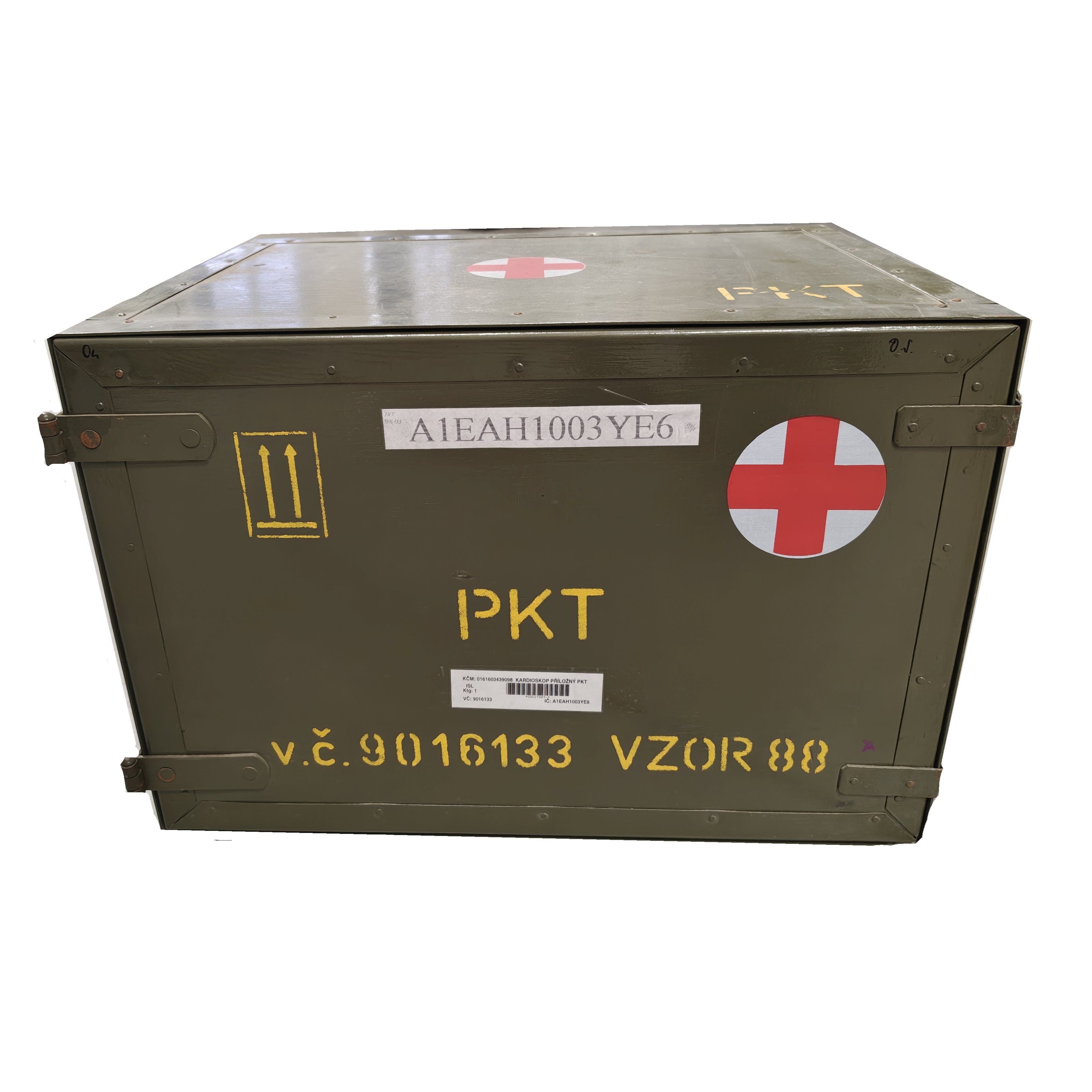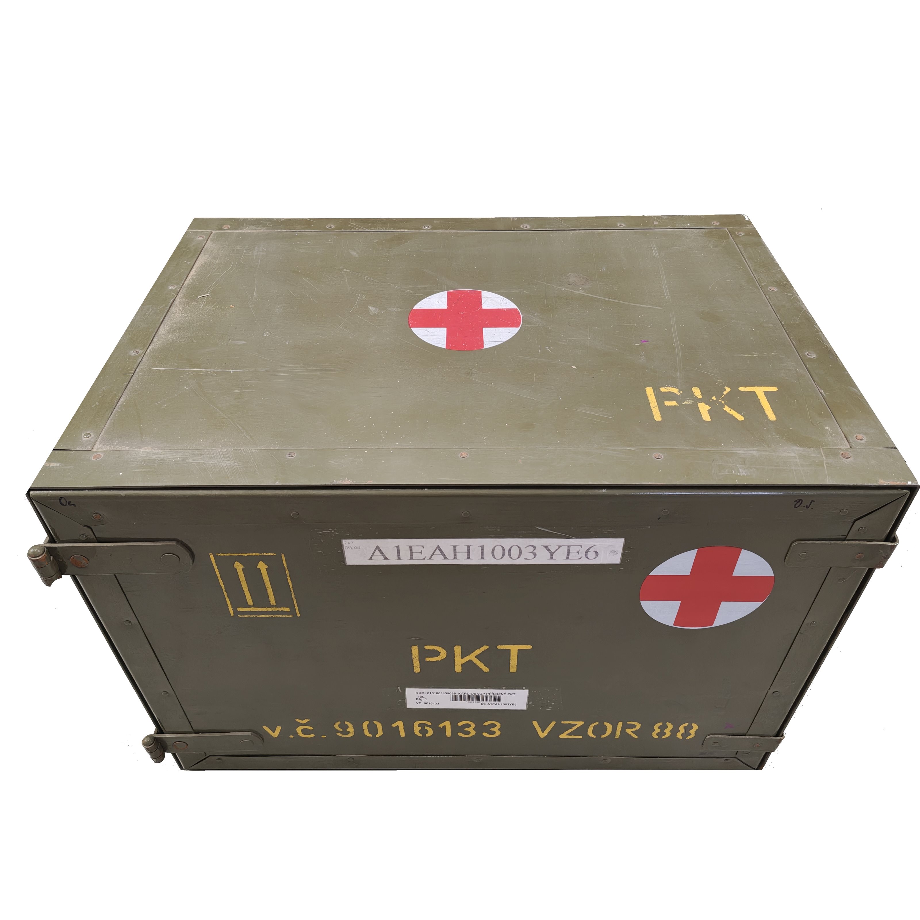 Dřevěná vojenská bedna se třemi zásuvkami a stolkem. Rozměr cca 57,5 x 39,5 x 39,5 cm. Hmotnost 25 kg. Další informace