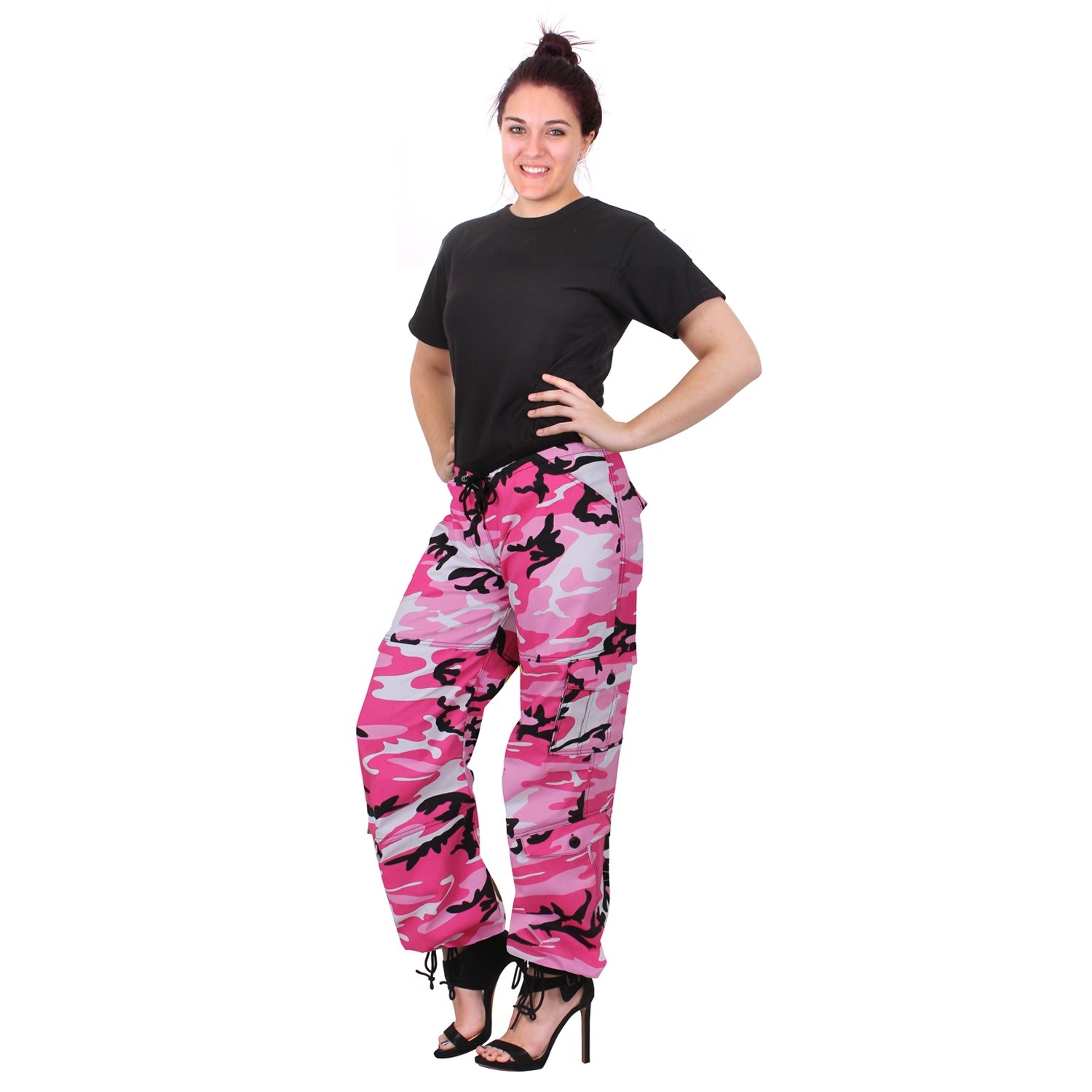 Pohodlné a módní maskáčové kalhoty typu paratrooper v dámském provedení. Ideální na běžné nošení. Velké kapsy po stranách na knoflíky a dvě zadní kapsy. Lze nosit bez pásku, protože se dají stáhnout v pase pomocí šňůrky. Další informace