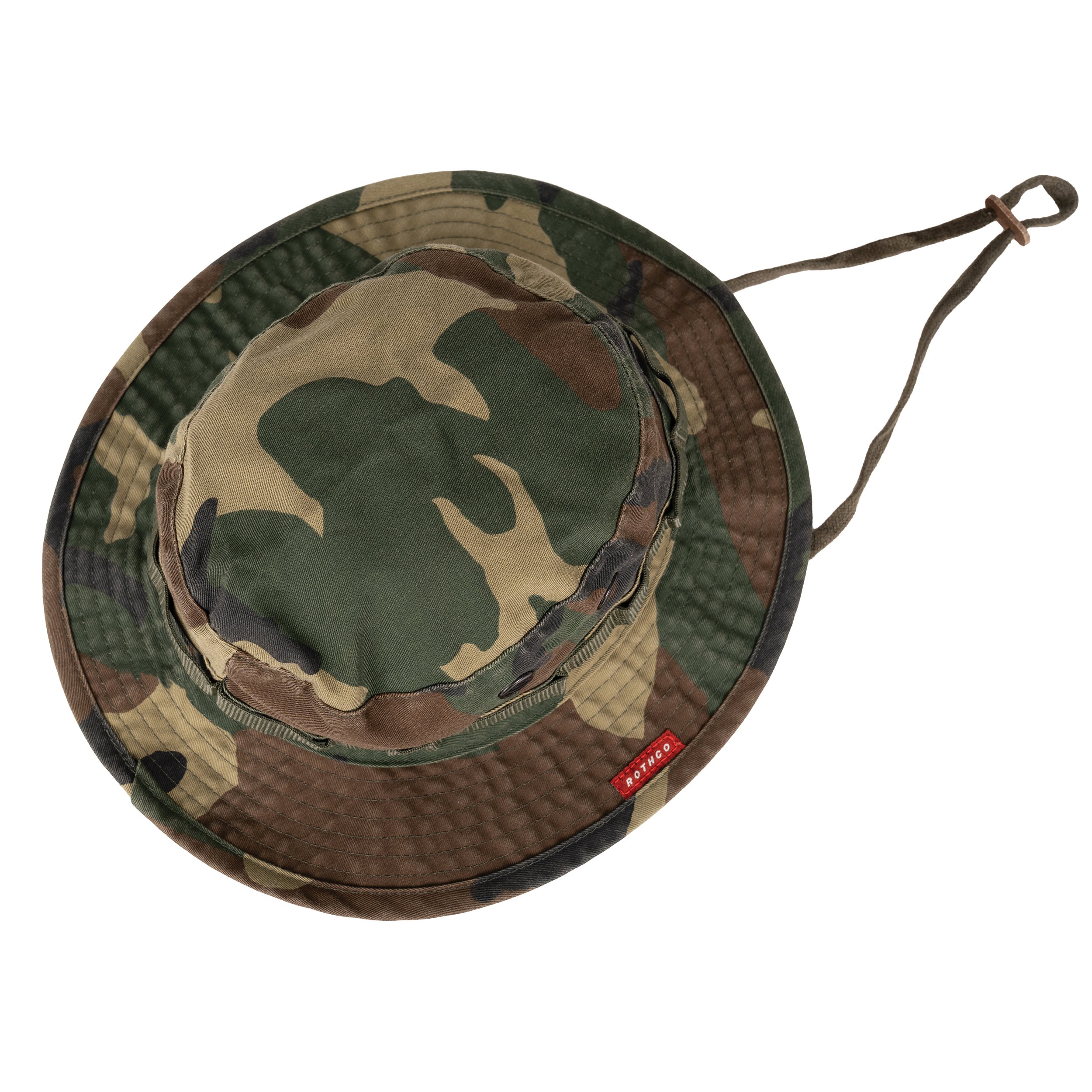Tento Boonie klobouk od firmy Rothco je ve vintage úpravě. Má čtyři ventilační otvory (s mřížkou), šňůrku pod krk s koženou zarážkou a poutka po obvodu klobouku pro upevnění dodatečné kamufláže (tzv. foliage ring).