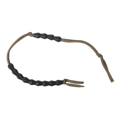 Třináct korálků navlečených na šňůrce, 4 korálky v horní části, 9 korálků v dolní části.