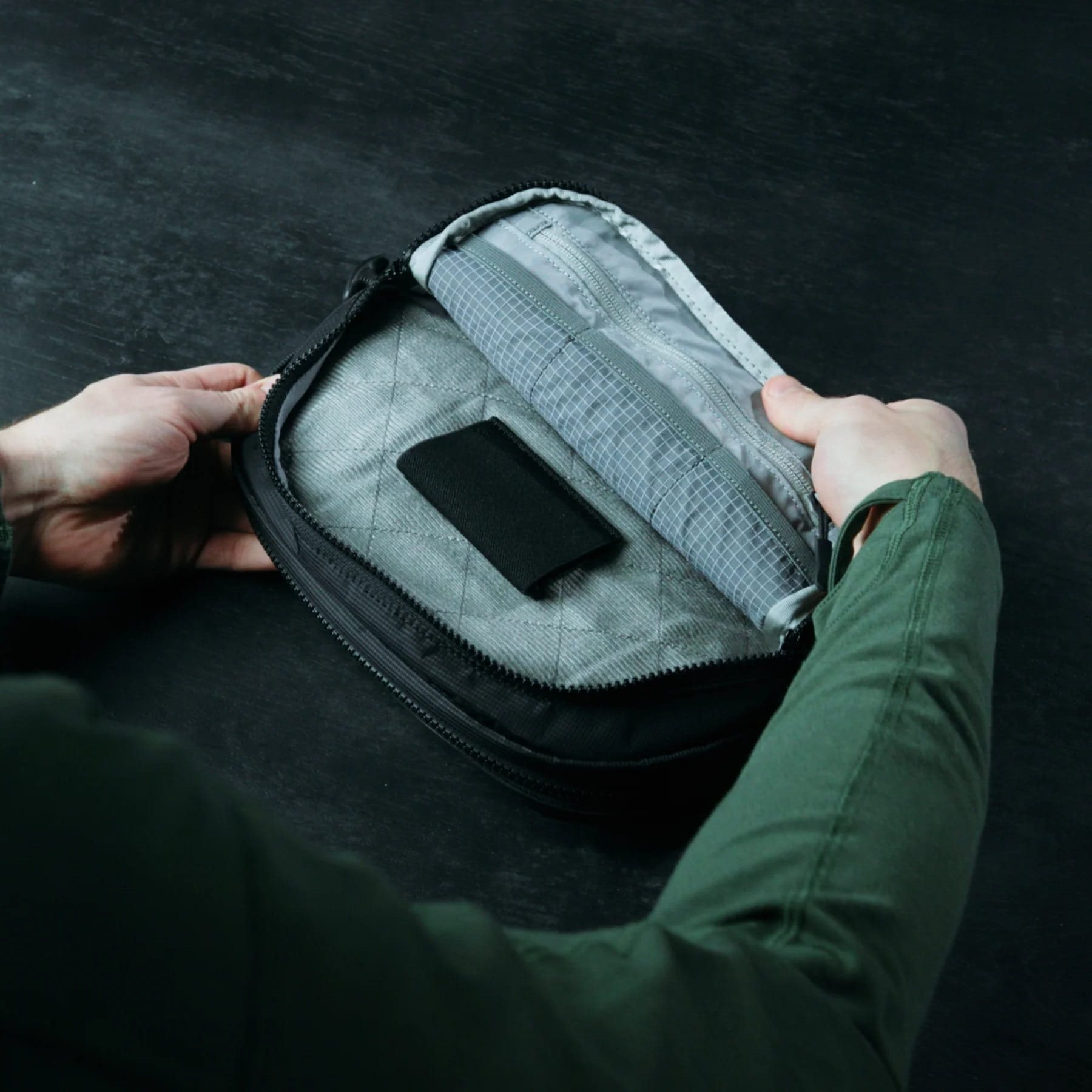 CCW ledvinka, kterou je možné po prodloužení nosného popruhu použít jako minimalistický batoh přes jedno rameno s možností skrytého nošení krátké palné zbraně včetně jejího kolimátoru. Další informace