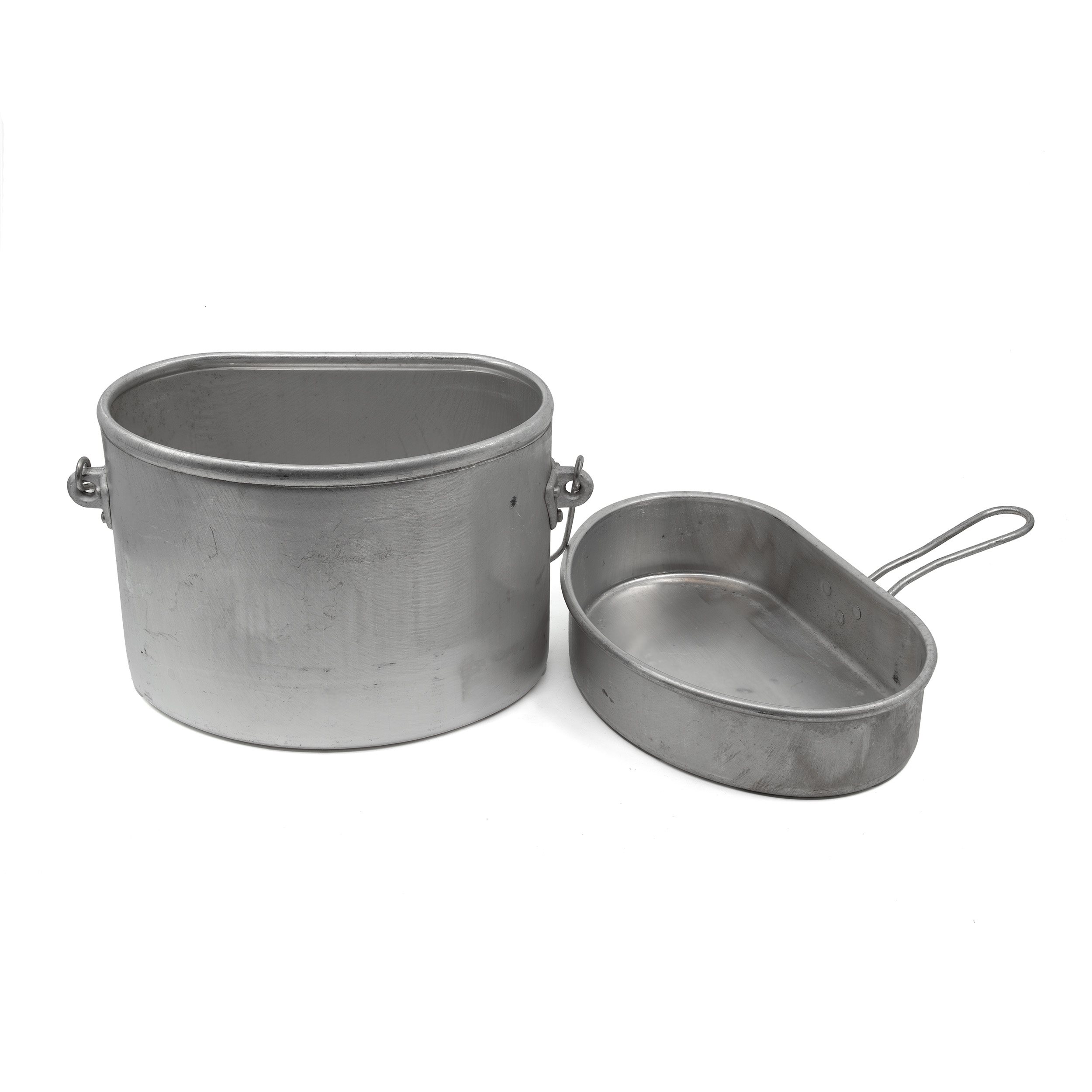 Stará poválečná hliníková dvodílná sada nádobí italské armády. Rozměry cca 13 x 20 x 14 cm. Dlouhodobě uložené skladové zboží. Většinou nové nebo mírně použité, avšak zvenčí jeví známky opotřebení vllivem skladovaní a manipulace.