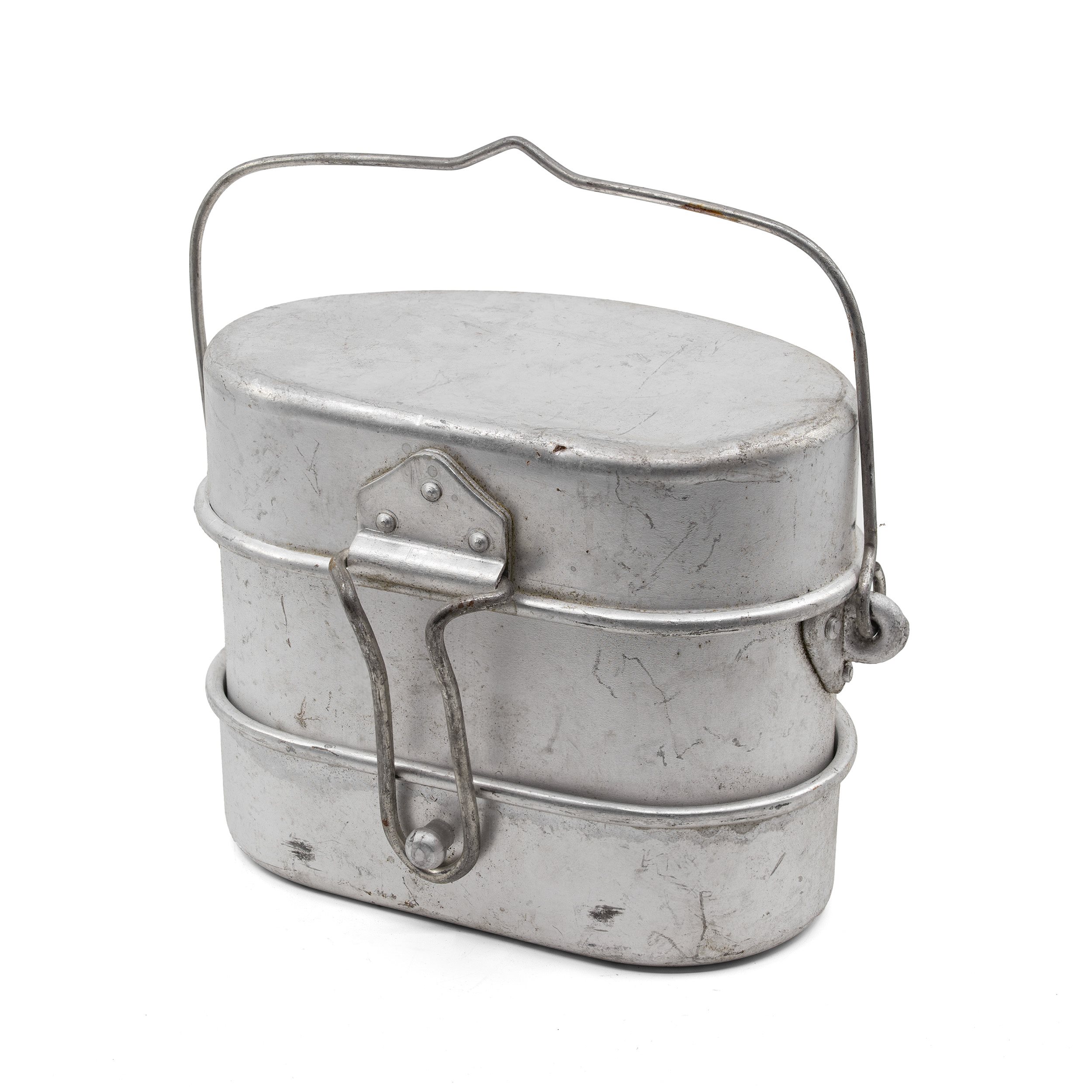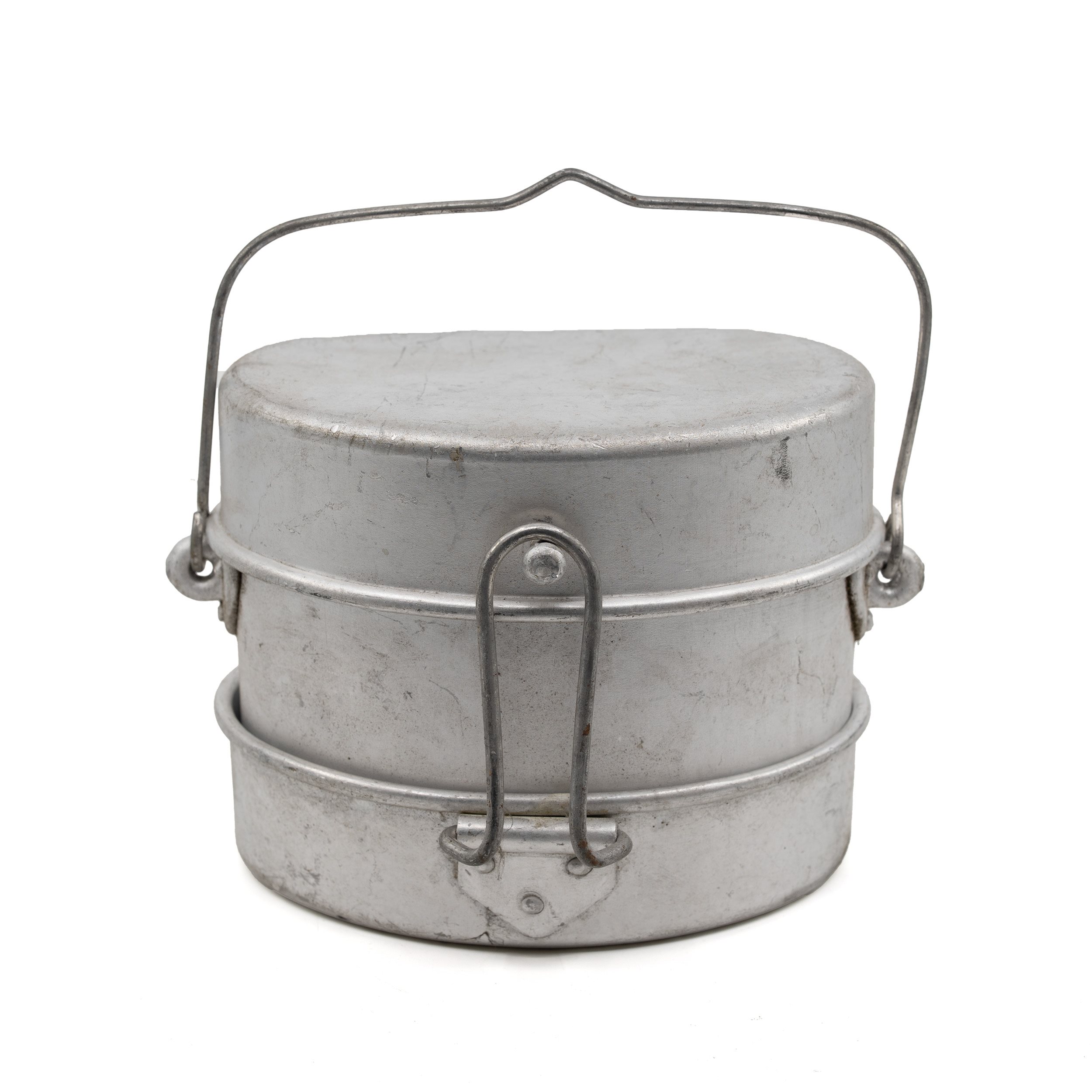 Stará poválečná hliníková třídílná sada nádobí italské armády. Rozměry cca 16 x 10 x 13 cm. Dlouhodobě uložené skladové zboží. Většinou nové nebo mírně použité, avšak zvenčí jeví známky opotřebení vllivem skladovaní a manipulace.