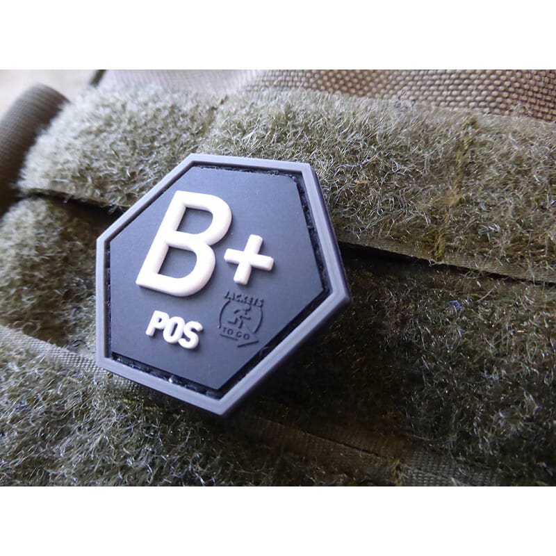 Plastová nášivka s označením krevní skupiny. Rozměr cca 3,8 x 3,3 cm, na rubu se suchým zipem. Materiál - dobře udržovatelné PVC. Další informace