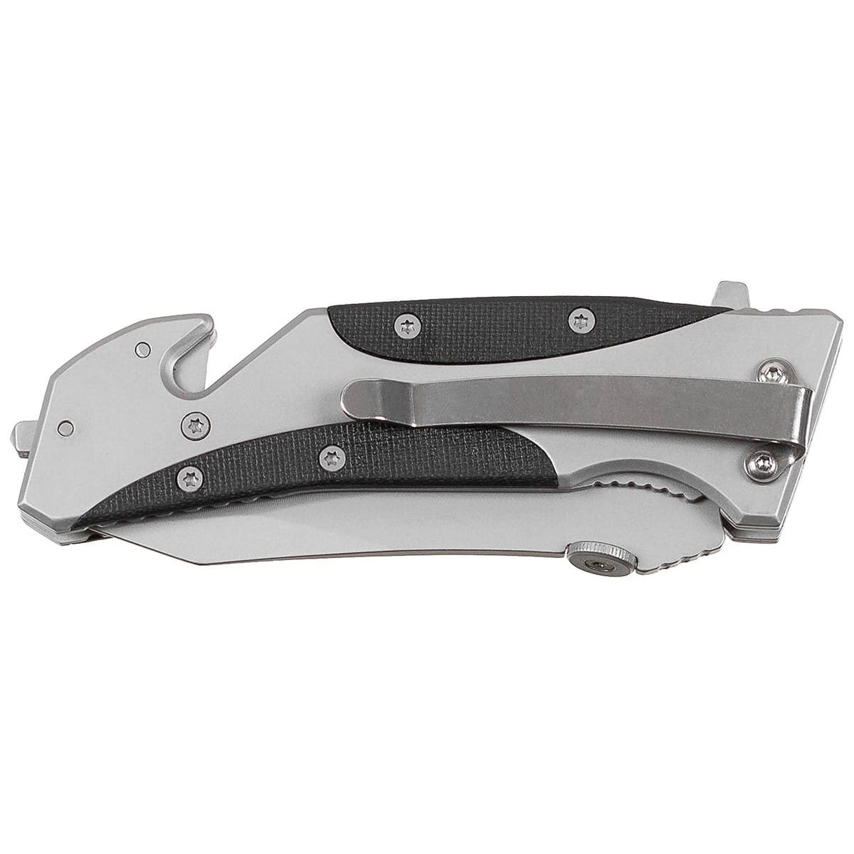 Zavírací nůž z nerezové oceli s kovovou rukojetí s plastovými vložkami. S řezákem pásů, rozbíječem skla a klipem pro uchycení k opasku. Další informace