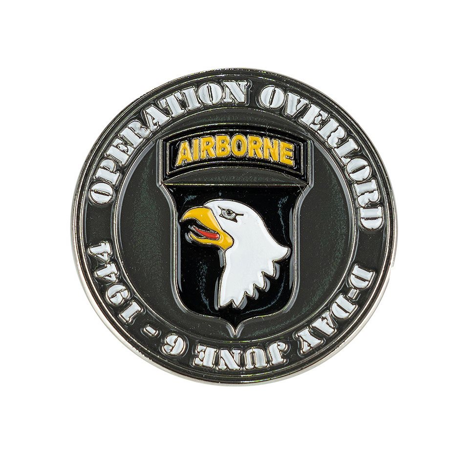 3 x 3 cm kovový odznak z edice připomínající operaci Overlord, neboli legendární vylodění v Normandii, které proběhlo v roce 1944. Střed odznaku zdobí insignie 101 výsadkové divize "Křičící orlové", která se obzvláště vyznamenala jak během dne D, tak během operace Market Garden, bitvy o Výběžek apod. Odznak se připevňuje pomocí kovového pinu.