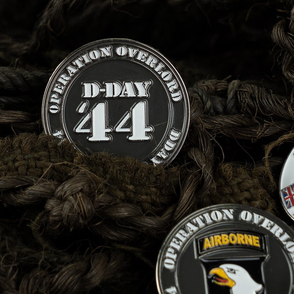 3 x 3 cm kovový odznak z edice připomínající operaci Overlord, neboli legendární vylodění v Normandii, které proběhlo v roce 1944. Odznak se připevňuje pomocí kovového pinu.