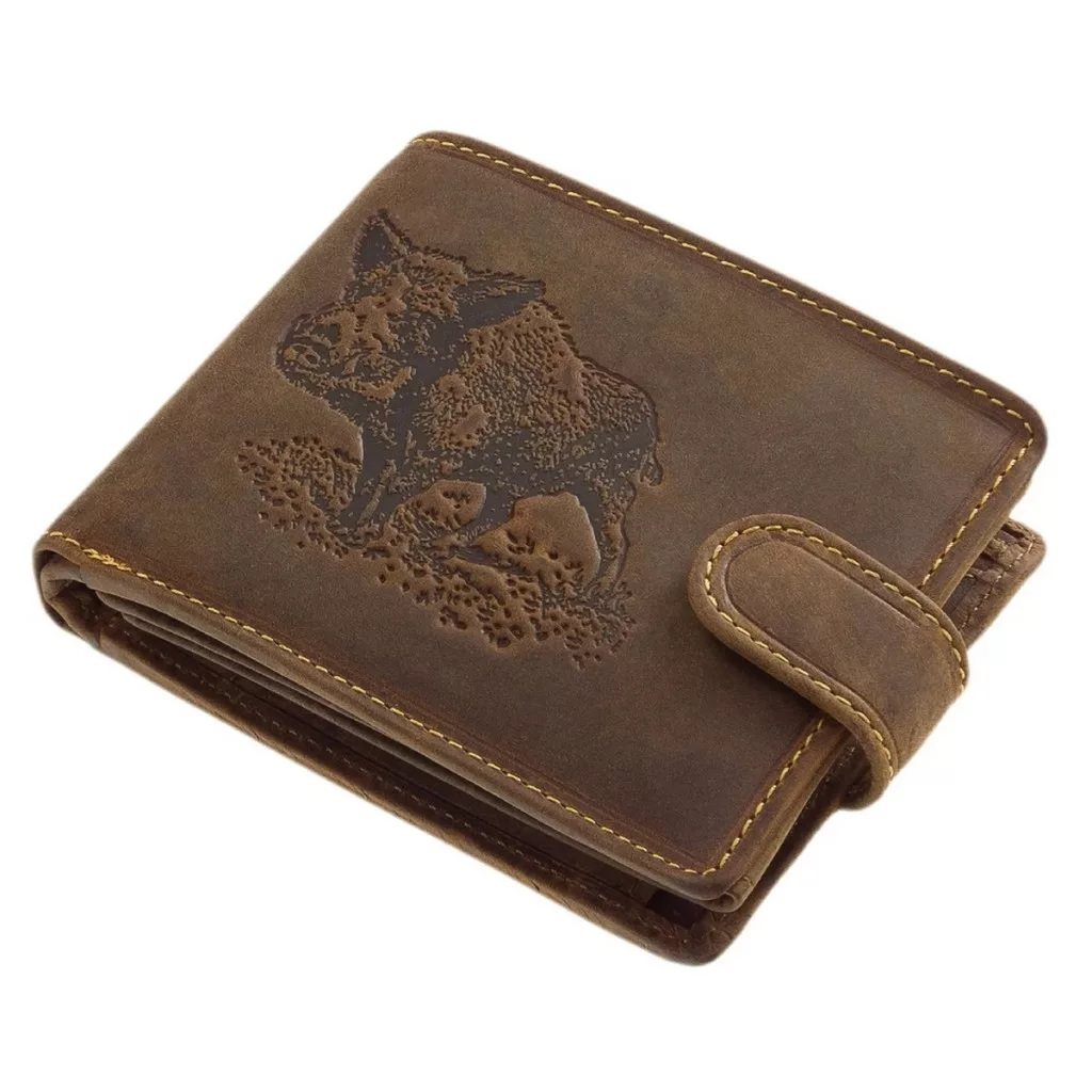 Kvalitně provedená peněženka vyrobená z prémiové kůže s vyobrazením divokého prasete, která je uložená v dárkové krabičce. Další informace