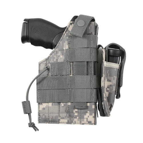 Pistolové pouzdro s elastickým popruhem pro bezpečné uložení zbraně v pouzdře. Samostatná kapsa na zásobník, odnímatelné MOLLE popruhy - lze uzpůsobit pro praváky i leváky. Materiál: 600D polyester. Další informace