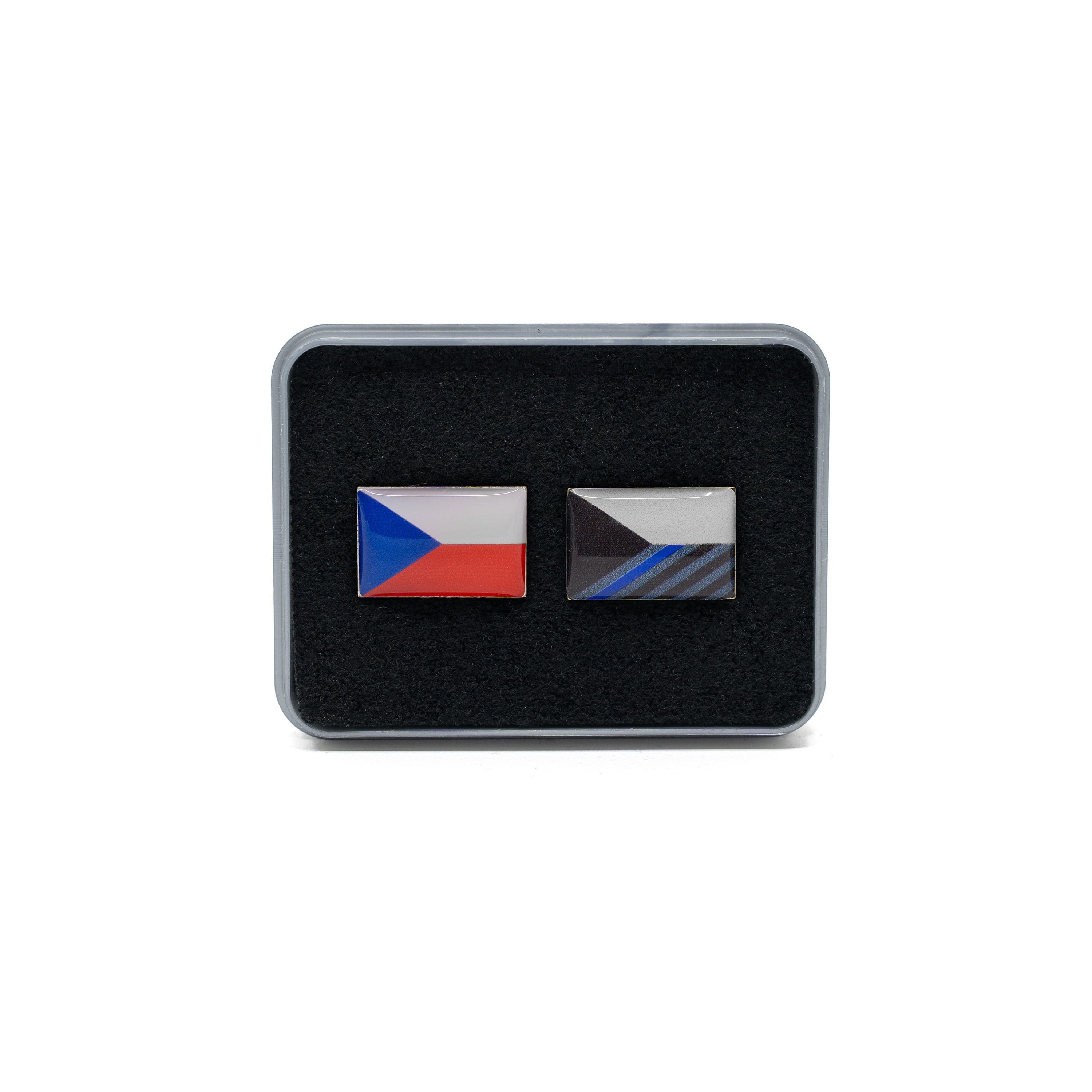 Sada obsahující vlajku ČR a vlajku ČR s modrým pruhem, která symbolizuje respekt ke služebnímu sboru PČR. Odznaky jsou opatřeny připínáním na PIN (trn se zajištěním). Dodáváno v dárkové krabičce. Kvalitní provedení, česká výroba.