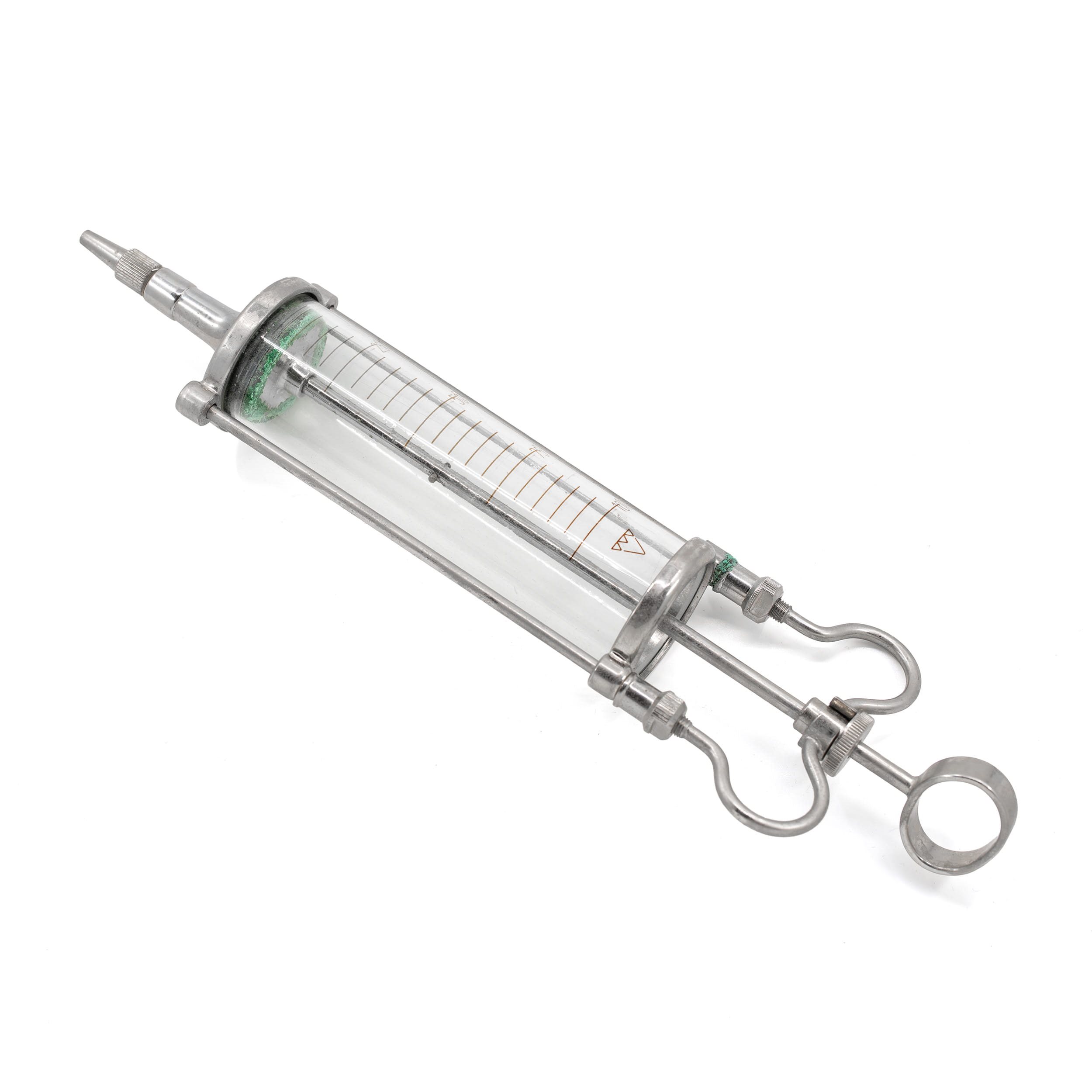 Skleněná injekční stříkačka. Objem injekce 100ml. Dlouhodobě uložený materiál bez záruky funkčnosti. Další informace