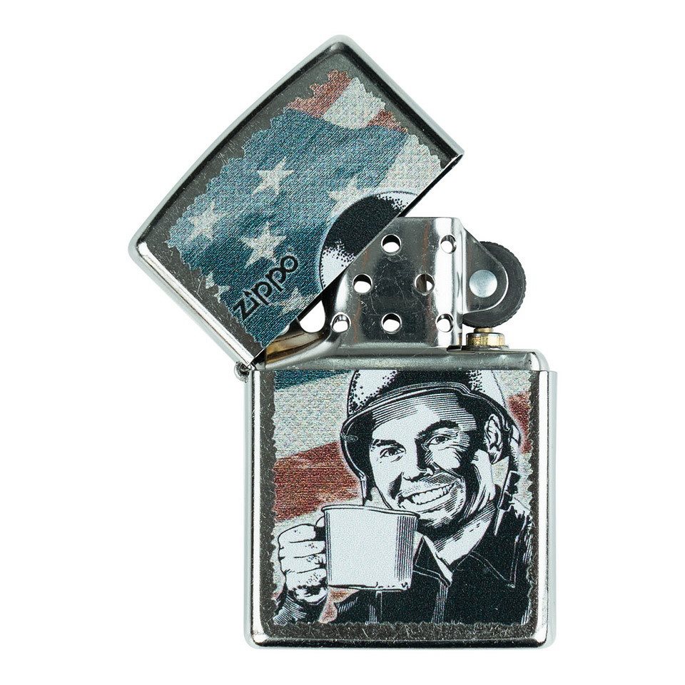 Klasický benzínový zapalovač ZIPPO s vyobrazením amerického G.I. Joe vojáka s pozadím americké vlajky. Další informace
