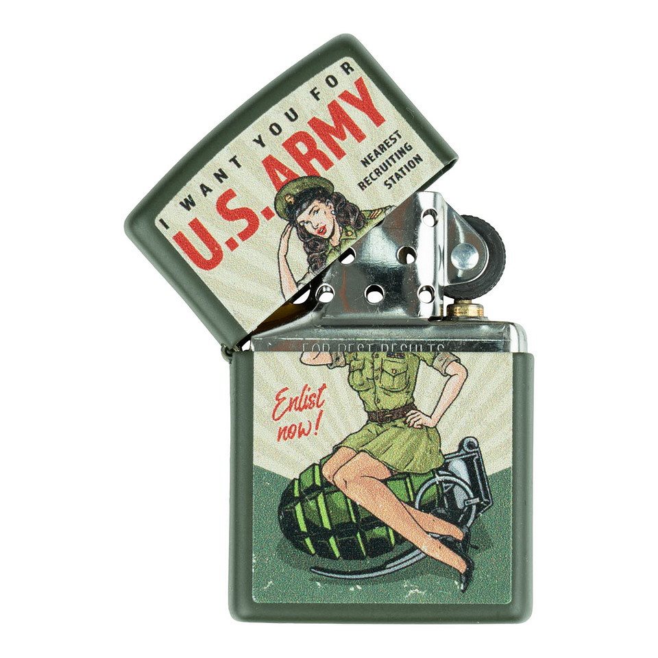 Klasický benzínový zapalovač ZIPPO s obrázkem inspirovaným klasickými náborovými plakáty americké armády. Je vyrobený z odolného kovu a plamen zapalovače odolá i větru. Dodáván v dárkové krabičce.